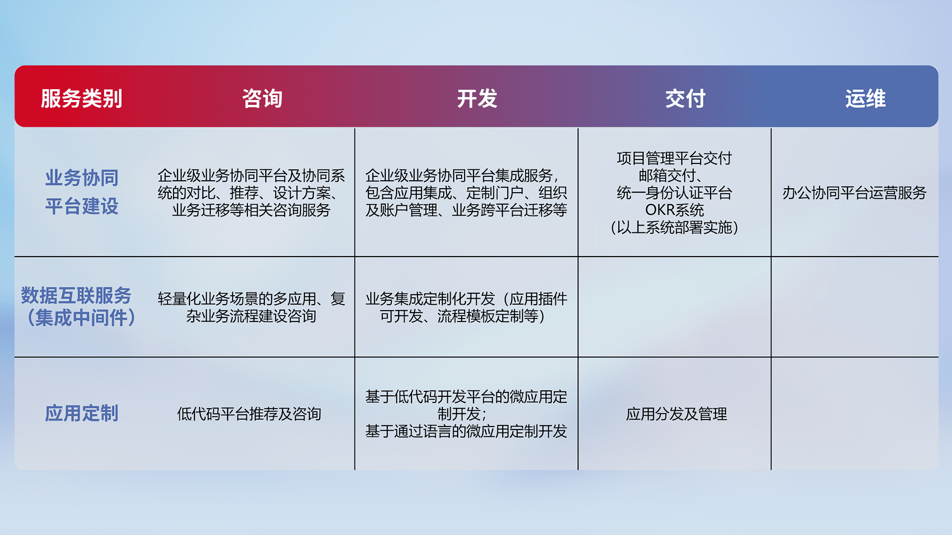 针对钉钉、、企微、、、、IDaas等平台级产品提供产品的规划、、、方案、、、、交付、、、、定制化开发等服务,,,实现如统一协同办公、、、、智能客户服务、、混合会议管理、、、智能数据查询、、、等业务场景,,,,实现数字化转型。。