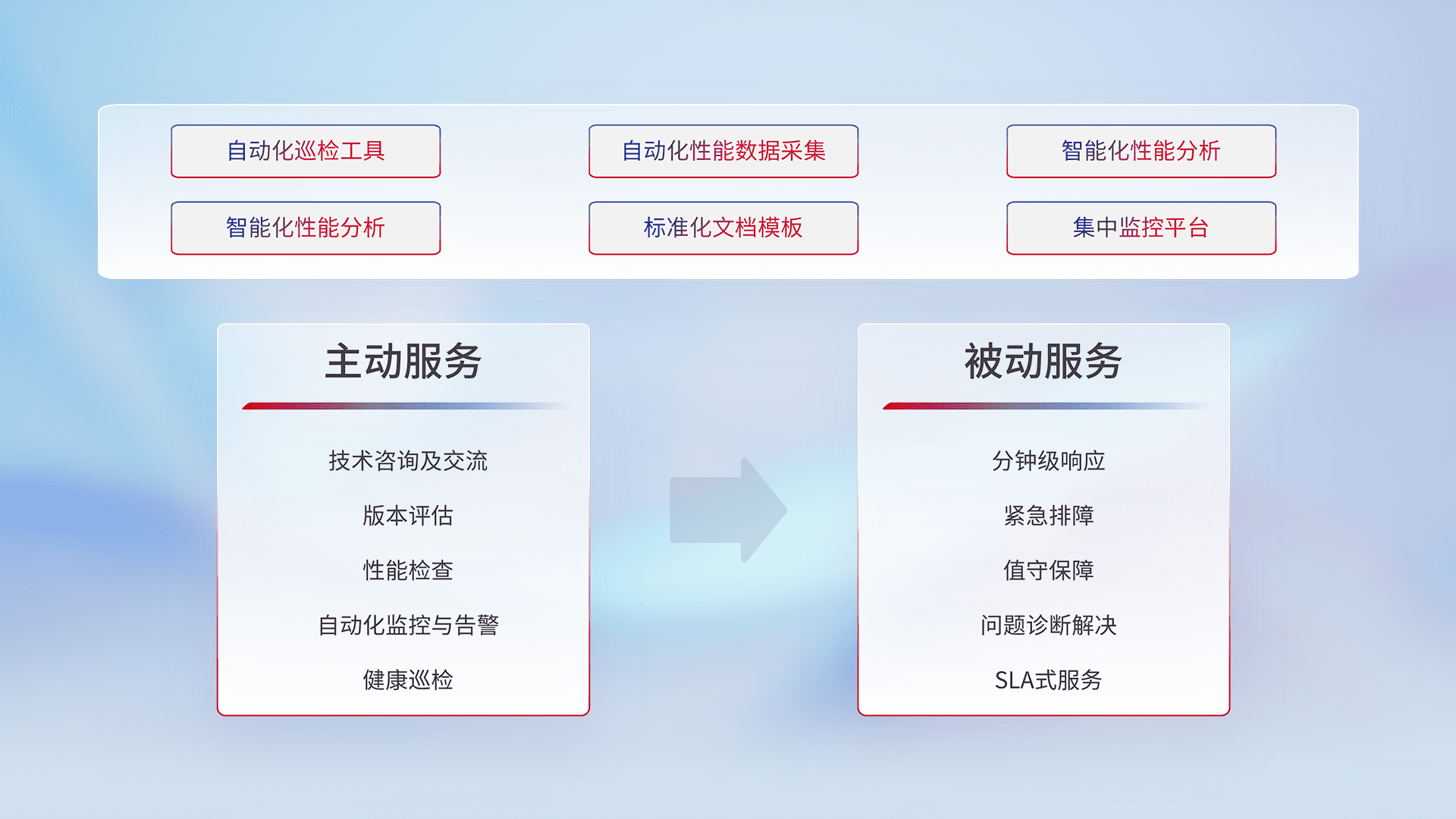 智能化工具和标准化文档,,保障服务质量,,提供主动服务(包含技术咨询、、、版本评估、、性能检查、、、、自动化监控与告警、、、、健康巡检)和被动服务包含(分钟级响应、、、、紧急排障、、值守保障、、、、问题诊断解决、、SLA服务)。。。